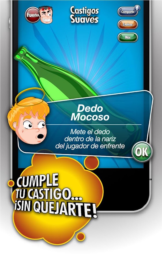 Colócate alrededor de tu dispositivo, y gira la botella con un dedo…alguno de tus amigos recibirá un reto que realizar, y cuando veas el "castigo" que sale….¡no podrás con la risa!